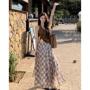 红人馆a字半身裙女2025新款夏季长裙咖色格子韩系纱裙设计感裙子