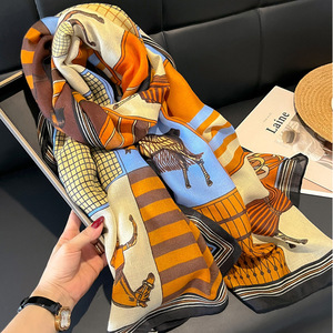 新款时尚印花棉麻质感围巾韩版百搭骏马丝巾秋冬围脖长款休闲百搭