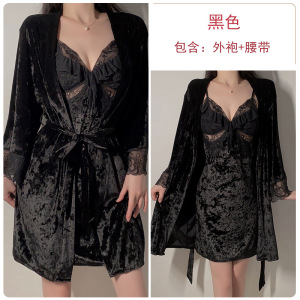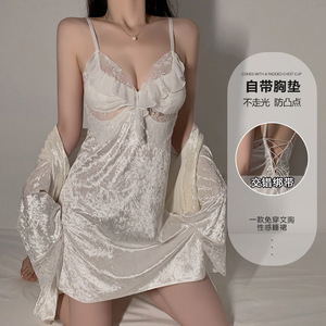 瑰若激情深V加胸垫内衣纯欲甜美丝绒睡裙开襟系带外袍女套装4953