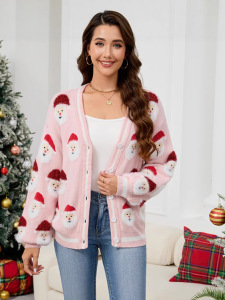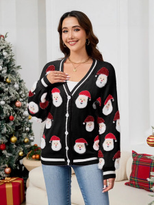 欧美跨境女装休闲圣诞老人提花毛衣开衫秋冬新款亚马逊圣诞毛衣