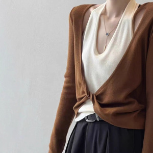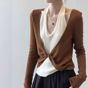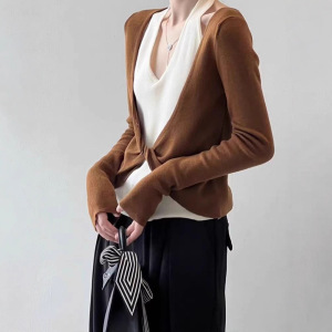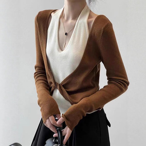 2025秋季新款流行独特别致设计轻奢高级感显瘦百搭咖色假两件上衣