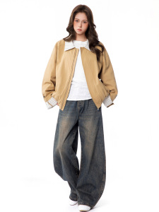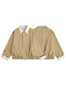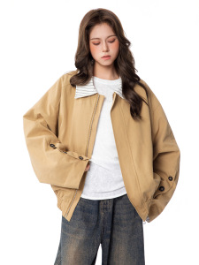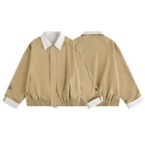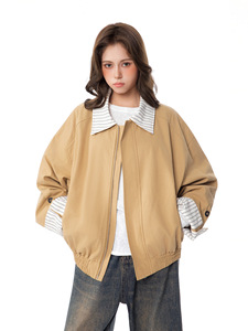 日系复古卡其色纽扣拼接条纹翻领休闲外套女秋季休闲百搭长袖夹克