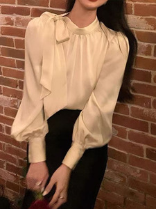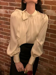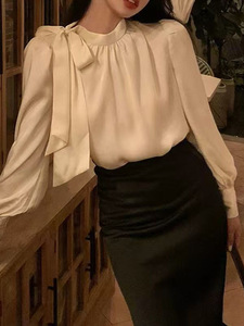 蝴蝶结白色衬衫女春秋设计感小众法式职业醋酸缎面衬衣小个子上衣