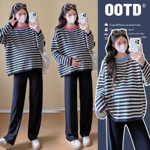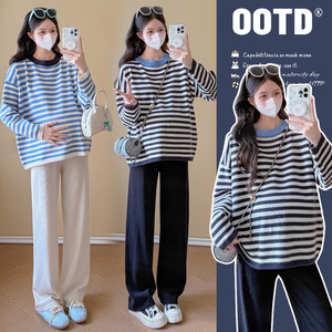 孕妇装圆领条纹毛衣秋冬新款慵懒风休闲宽松显瘦百搭套头孕妇上衣