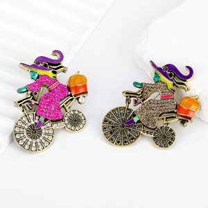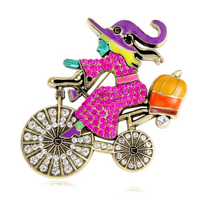 欧美时尚女巫骑自行车南瓜胸针镶钻滴油创意万圣节卡通搞怪配饰
