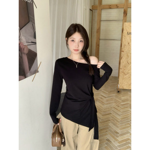 大码胖妹妹秋季新款设计感一字肩斜肩不规则绑带长袖T恤上衣
