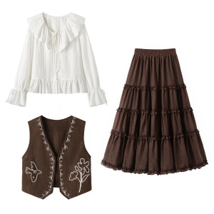 2025秋新款马甲荷叶边肌理感衬衫美拉德木耳边半身裙三件套女
