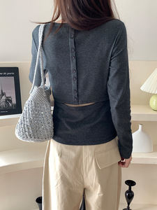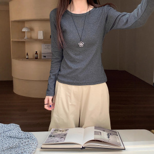 薇颂韩系小心机露腰圆领长袖t恤女秋季新款修身显瘦百搭休闲上衣