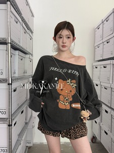 ME KAKAMEE十三行秋美式卡通KT宽松斜肩长袖上衣T恤(配公仔)S3610