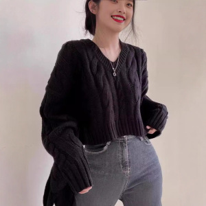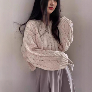 2025复古麻花V领套头长袖毛衣女秋冬新款宽松短款慵懒风针织上衣