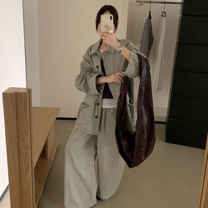 韩国东大门2025秋新款高级气质工装风翻领系带衬衫女直筒长裤套装