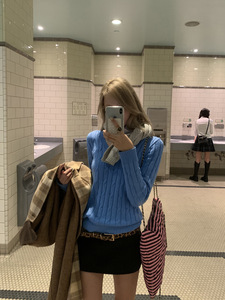 8uioio《比利时钟声》蓝色V领麻花毛衣女秋季新款长袖针织衫上衣