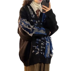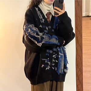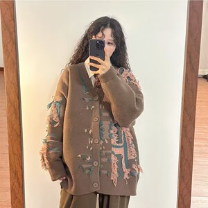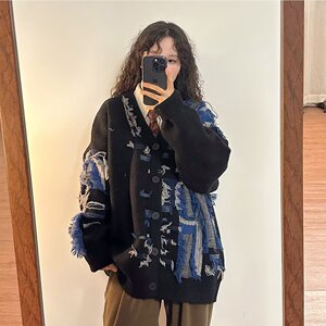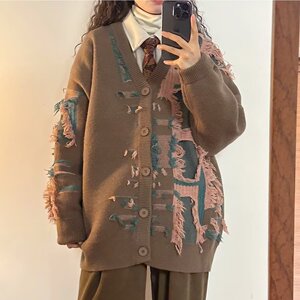 秋冬复古破旧拼接慵懒风撞色开衫毛衣女潮流宽松出来针织外套针织