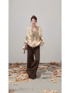 【厂家源头现货直发】抽褶连帽V领长袖卫衣女秋韩系宽松休闲上衣
