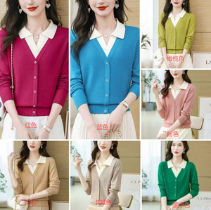 假两件POLO领针织衫毛衣女秋冬新款拼色高档保暖韩版短款打底上衣