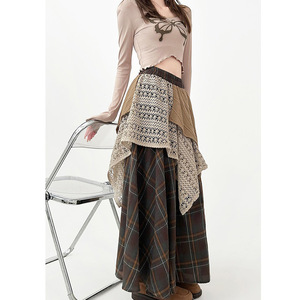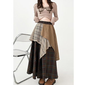 大码胖mm日系复古半身裙女2025冬季不规则微胖格子蕾丝拼接长裙子