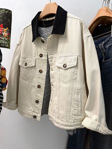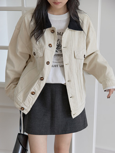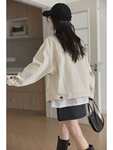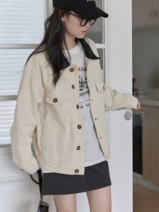 灯芯领撞色翻领巴恩风牛仔外套女复古高级感米白色宽松廓形夹克秋