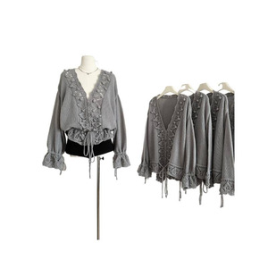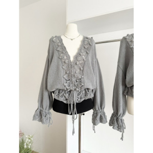 塞纳温柔风镂空钩花喇叭袖毛衣女2025新款V领抽绳设计感针织上衣