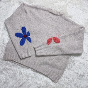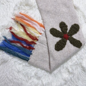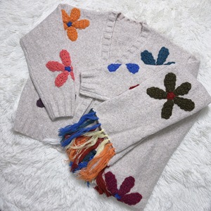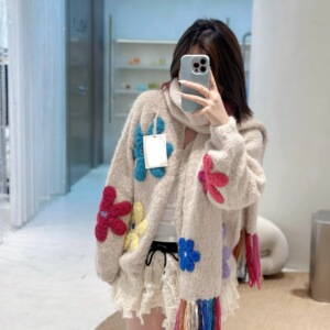 2025秋冬新款撞色立体花朵宽松休闲V领针织开衫外套+围巾套装