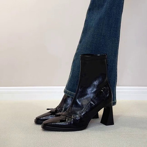 羊皮版~复古蝴蝶结高跟靴小方头气质粗跟短靴后拉链弹力瘦瘦靴女