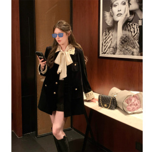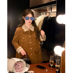 杨小卷 MIU系复古翻领中长款麂皮/丝绒外套工装风衣女 美拉德穿搭