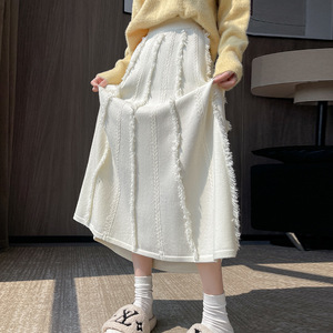 麦穗麻花针织半身裙女奶白色温柔风a字长裙流苏百褶大摆伞裙秋冬