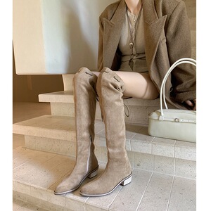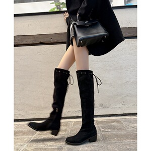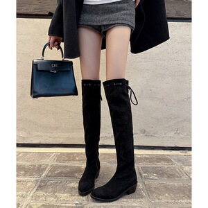 腿精两穿可调筒高过膝靴2025冬粗中跟圆头绒面系带堆堆高筒长靴女