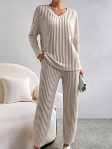 跨境欧美女装2025秋季上新直筒裤气质宽松V领上衣两件套欧美风