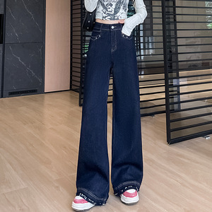 高腰微喇阔腿牛仔裤女长裤春秋季新款宽松显瘦垂感拖地裤子毛边