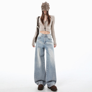 浅蓝色牛仔裤女款秋季新款美式设计感宽松显瘦垂感慵懒拖地阔腿裤