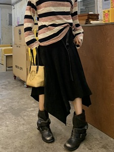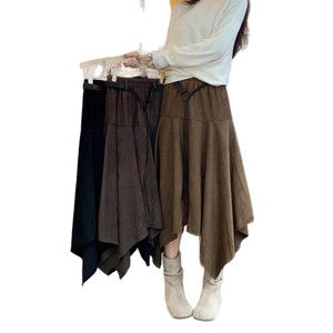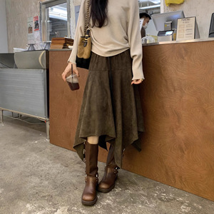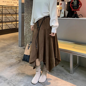 设计感不规则燕尾半身裙女秋冬新款高腰显瘦A字裙中长腰带麂皮裙
