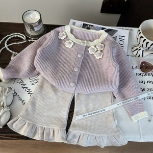 韩版童装2025新款秋季女童花朵毛衣开衫儿童百搭针织喇叭裤两件套