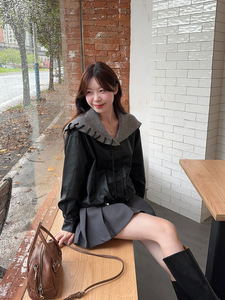 大码女装早秋设计感海军领pu皮夹克短款外套女