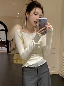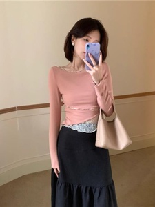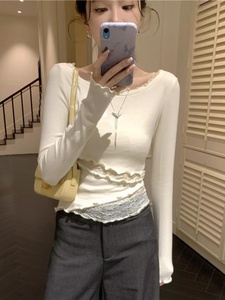 法式蕾丝拼接针织打底衫女秋冬内搭弹力T恤显瘦气质镂空显瘦上衣