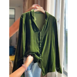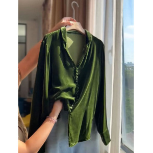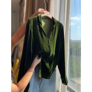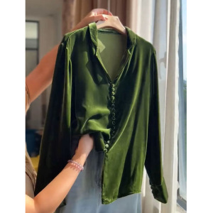 绿色翻领丝绒长袖衬衫女2025秋季新款高级感时尚洋气时髦大码上衣