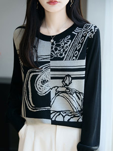 【厂家直供】秋季新款圆领长袖针织毛衣女士拼色提花减龄打底上衣