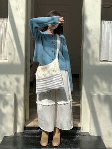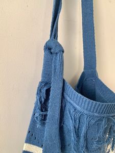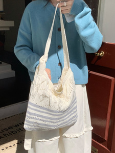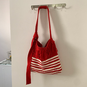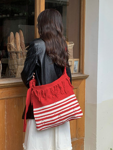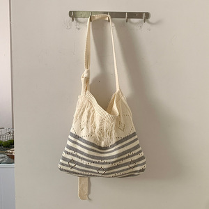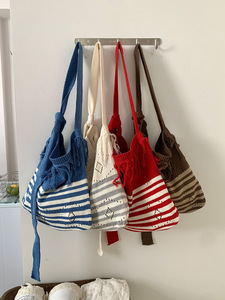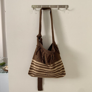 2025亚马逊新款斜跨条纹针织包包可调节单肩包复古撞色流苏编织包