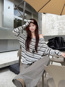 韩系斜领露肩条纹长袖T恤慵懒抽绳阔腿裤女2025秋季新款时尚套装