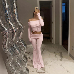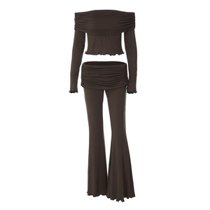 欧美风女装2025秋季新款一字领褶皱木耳边长袖上衣低腰喇叭裤套装