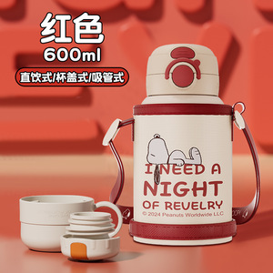 史努比儿童背带保温杯600ML大容量水壶男女通用高颜值学生水杯