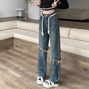 牛仔裤女秋冬季新款复古设计感拼接直筒韩版宽松显瘦高腰阔腿裤潮