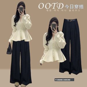 秋季穿搭一整套女2025新款韩版感收腰针织毛衣阔腿裤两件套潮