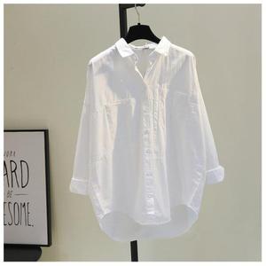春韩版宽松文艺风休闲衬衣双口袋前短后长白色棉衬衫女潮