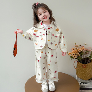 2025新款女童牛仔套装米白色小花刺绣韩版洋气秋季两件套幼儿园