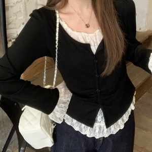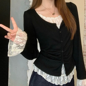 2025秋季显瘦遮肉蕾丝拼接上衣黑色假两件正肩长袖