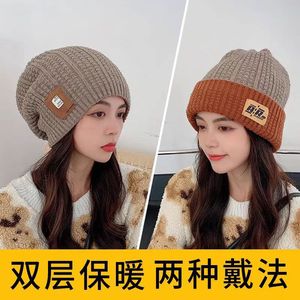 帽子冬季新款女日系针织帽堆堆帽双面可戴包头护耳大头保暖毛线帽