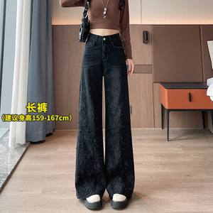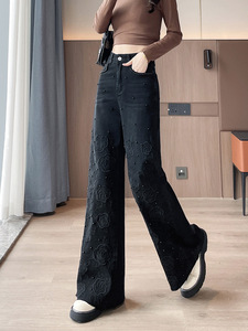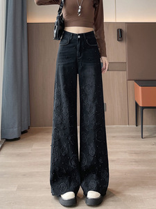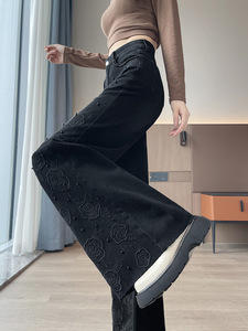 黑色绣花烫珠2025秋季新款高腰喇叭牛仔裤女宽松休闲剪脚毛边长裤