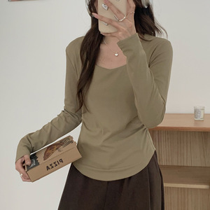 小众卡腰褶皱t恤女低领漏锁骨打底衫春秋大领口纯欲百搭长袖上衣