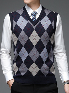V领羊毛背心秋冬加厚男士无袖菱形格针织马甲内搭提花毛衣男坎肩