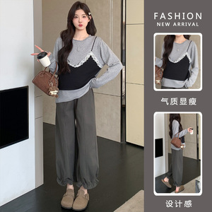 孕妇装2025秋季新款蕾丝边假两件上衣+工装裤高级感显瘦辣妈套装